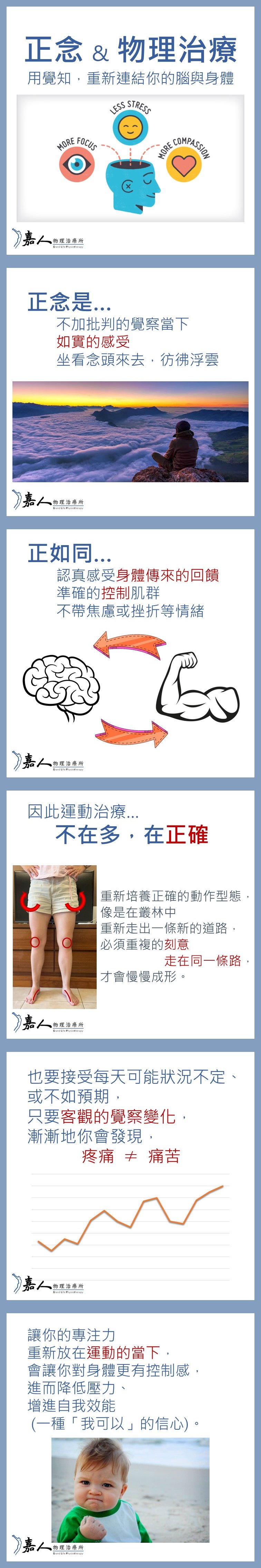 近年正念思考、正念減壓越來越為人熟知,但您知道嗎?在物理治療教導運動或感受本體感覺的過程中,其實跟正念的概念也相當類似。我們很強調「控制」的概念,這是重塑我們大腦如何使用身體的過程,我們可能會使用鏡子、觸覺、氣壓計…來幫助我們連結身體的感知,並重新學習每一塊肌肉的開關及動作程序。在練習專注控制的當下,我們便可以漸漸將「疼痛」和「痛苦」區分開來,也能讓我們對身體更有控制感,進而降低壓力、增進自我效能。