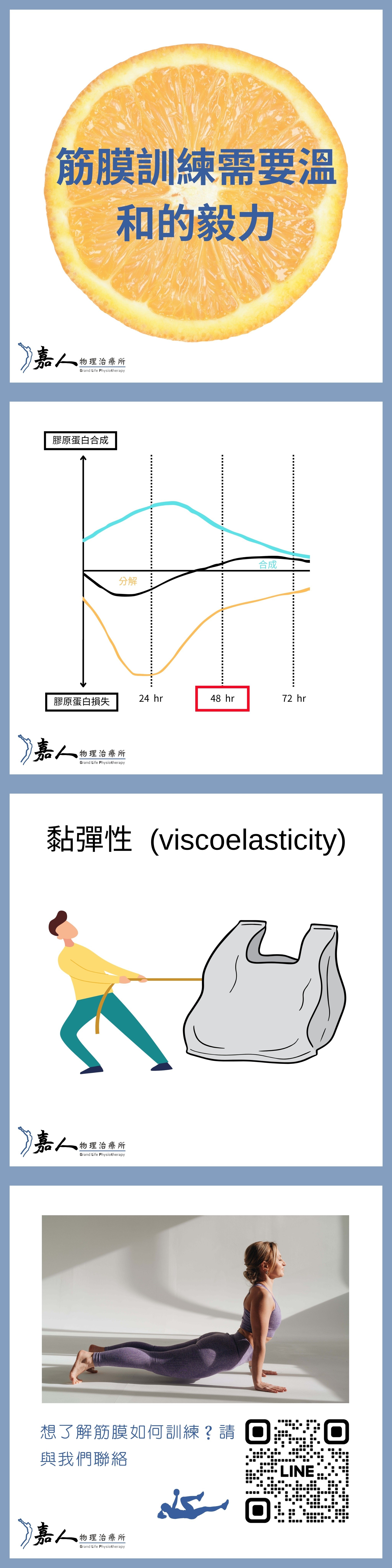 1. 膠原蛋白的半衰期約1年=>改變筋膜系統通常需為期6~24個月 (ex.運動要改變體態需持續半年以上)