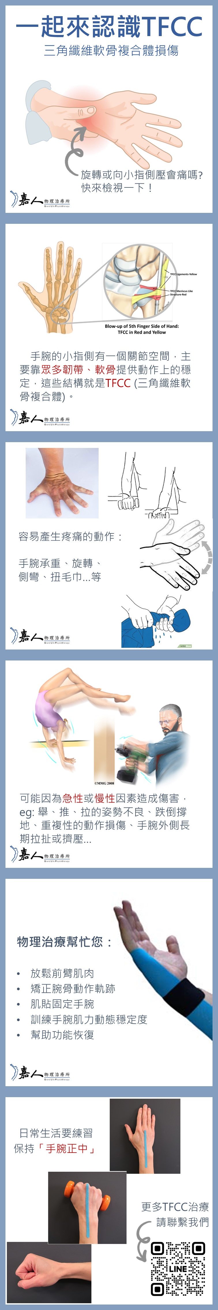 近年健身及運動風氣盛行,但在推、舉、拉...的過程中若手腕姿勢沒有穩定好,就容易造成手腕疼痛,TFCC是其中的一種,中文全名是「三角纖維軟骨複合體損傷,既然是複合體,就有可能是多種方向的損傷,因此治療時也要考量不同方向的復位及穩定度,就讓我們一起來了解TFCC吧!