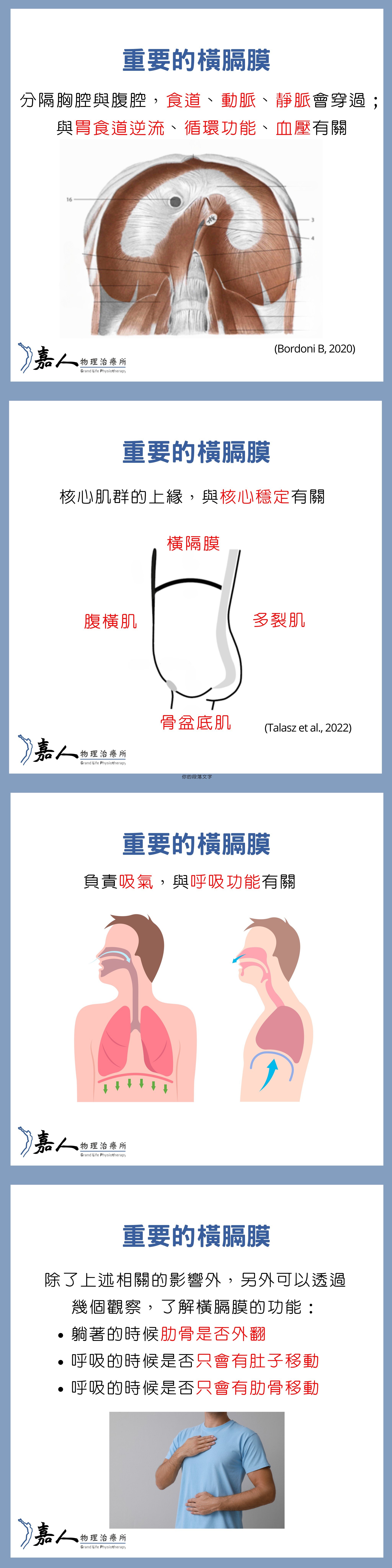 橫膈膜是負責吸氣的肌肉,與呼吸功能有關;也是核心肌群的其中之一,會影響核心穩定。常見的肩頸痠痛與下背痛都有機會與橫膈膜的失能有關。